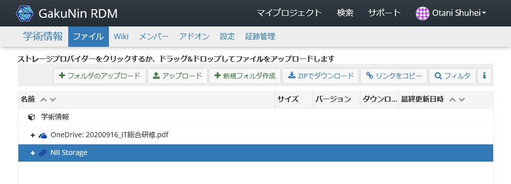 4. 「ファイル」タブ、「NII Storage」を選択、「フォルダのアップロード」で、解凍したフォルダを順次アップロード。
