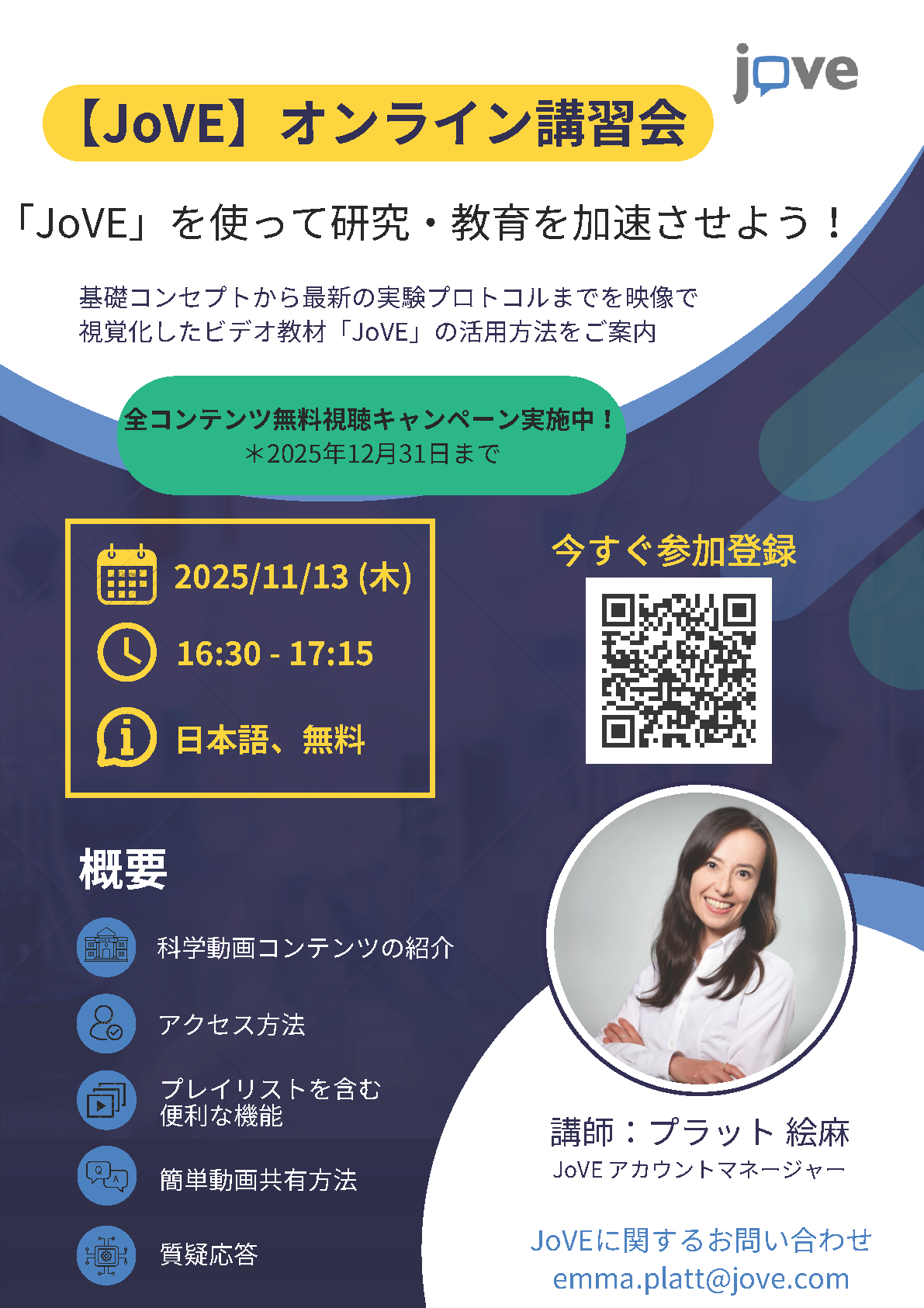 ビデオ学術誌「Journal of Visualized Experiments(JoVE)」のトライアル及び講習会開催【11/13(木)16:30~】