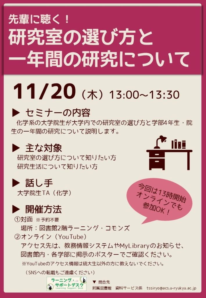 後日、琉大の構成員限定で動画を公開する予定ですが、質問したいことがある場合は当日の参加をおすすめします。