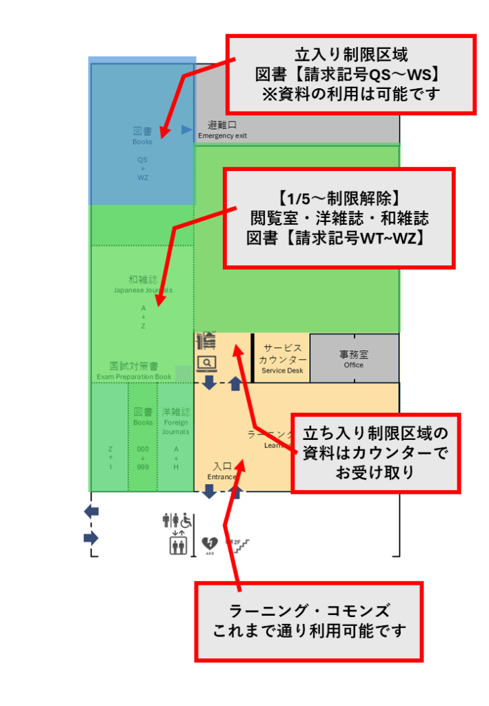 図書書架の一部(請求記号QS~WS)は引き続き立入りを制限しております。(作業終了後、速やかに制限を解除します)