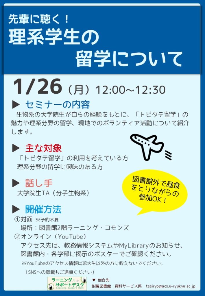 【1/26開催】セミナー「先輩に聴く!理系学生の留学について」のお知らせ
