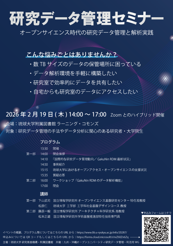 このたび、本学でも運用している国立情報学研究所のGakuNin RDMの最新状況の共有、および実践的なデータ管理・解析を目的としたセミナーを別紙のとおり開催いたします。