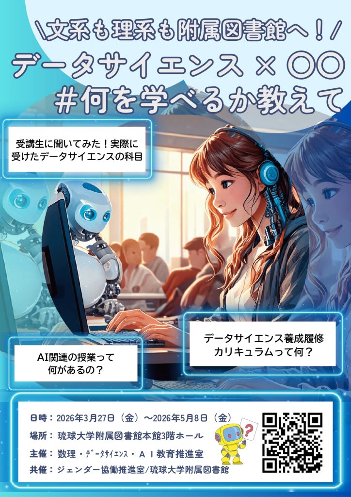 本学の数理・データサイエンス・AI教育推進室・ジェンダー共同推進室と連携し、企画展「\文系も理系も附属図書館へ!/ データサイエンス×○○ #何を学べるか教えて」を本館3階で開催します。