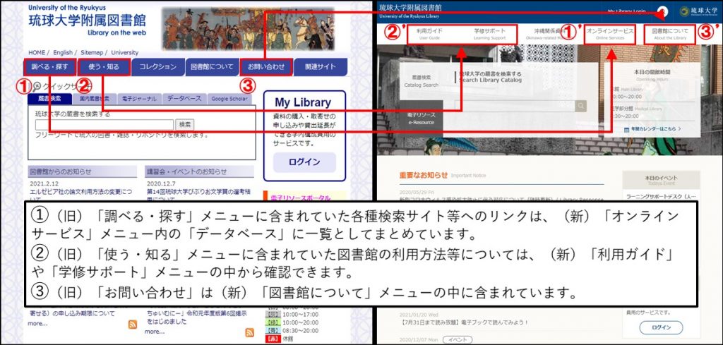 新しい図書館Webサイトでは、学修支援、沖縄関係資料といった当館の特色を強調した構成となっているなど、旧図書館Webサイトと画面構成が異なります。