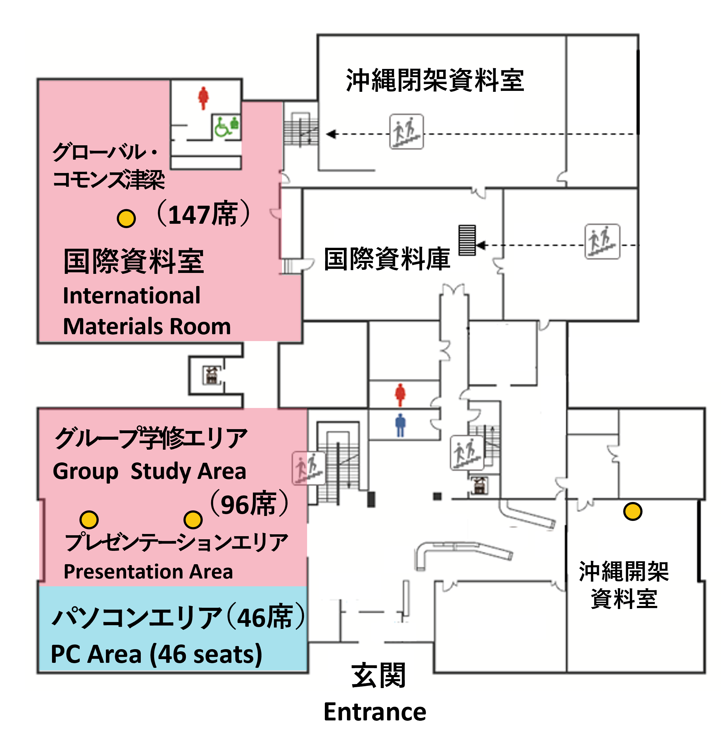 附属図書館では以下のとおり、複数の無線LANアクセスポイントを設置しておりますので、オンライン講義の受講場所等としてご利用いただけます。一部エリアでは、発話を伴うオンライン講義の受講も可能となっております。